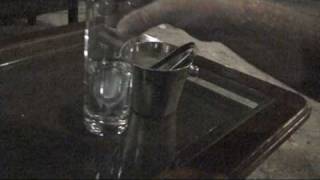 In shot glass, drop in one small ice cube. Pour in Ouzo and then Rumple Minze.